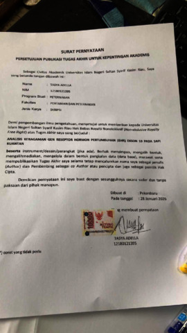 ANALISIS KERAGAMAN GEN RESEPTOR HORMON PERTUMBUHAN (GHR) EKSON 10 PADA SAPI KUANTAN Tasya Adella (12180121395) Di bawah bimbingan Restu Misrianti dan Elfawati INTISARI Penelitian ini bertujuan untuk mengidentifikasi keragaman gen reseptor hormon pertumbuhan (Growth Hormone Receptor/GHR) ekson 10 pada sapi Kuantan menggunakan metode Polymerase Chain Reaction–Restriction Fragment Length Polymorphism (PCR-RFLP). Sampel yang digunakan berupa darah dari 44 ekor sapi Kuantan yang berasal dari Kabupaten Kuantan Singingi dan Unit Pelaksana Teknis (UPT) Pembibitan dan Hijauan Dinas Peternakan dan Kesehatan Hewan Provinsi Riau. Analisis dilakukan untuk menentukan frekuensi genotipe, frekuensi alel, serta nilai heterozigositas pengamatan (Ho) dan heterozigositas harapan (He).Hasil penelitian menunjukkan bahwa pada gen GHR ekson 10 hanya ditemukan dua genotipe, yaitu AA dan GG, dengan genotipe AA sebagai genotipe yang paling dominan. Genotipe heterozigot AG tidak terdeteksi pada populasi sapi Kuantan yang diamati. Frekuensi alel A lebih tinggi dibandingkan alel G, menunjukkan bahwa alel A mendominasi pada populasi tersebut. Nilai heterozigositas pengamatan (Ho) lebih rendah dibandingkan nilai heterozigositas harapan (He), yang mengindikasikan rendahnya tingkat keragaman genetik gen GHR ekson 10 pada populasi sapi Kuantan. Rendahnya keragaman genetik ini diduga dipengaruhi oleh faktor seleksi, sistem pemeliharaan, serta penggunaan induk yang terbatas dalam proses pembibitan. Hasil penelitian ini dapat digunakan sebagai informasi awal dalam mendukung program seleksi, pemuliaan, dan konservasi genetik sapi Kuantan di masa mendatang. Kata kunci: sapi Kuantan, gen GHR, ekson 10, PCR-RFLP, keragaman genetik