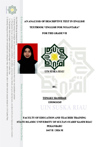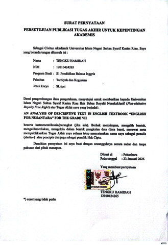 TENGKU HAMIDAH, - (2026) AN ANALYSIS OF DESCRIPTIVE TEXT IN ENGLISH TEXTBOOK “ENGLISH FOR NUSANTARA” FOR THE GRADE VII. Skripsi thesis, UNIVERSITAS ISLAM NEGERI SULTAN SYARIF KASIM RIAU.