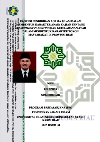 ABSTRAK Edi Azhar (2026): Urgensi Pendidikan Agama Dalam Membentuk Karakter Anak: Kajian Tentang Attachment Parenting Dan Keteladanan Ayah Dalam Membentuk Karakter Tokoh Masyarakat Di Provinsi Riau Penelitan ini dilatar belakangi pembentukan karakter tokoh-tokoh masyarakat di Riau dan keteladan ayah yang membentuk karakter anak menjadi tokoh di Riau. Rumusan Masalah dalam penelitian ini adalah; 1) Bagaimana urgensi Pendidikan Agama Islam dalam membentuk karakter anak melalui penerapan attachment parenting di Provinsi Riau?, 2) Bagaimana keteladanan ayah berkontribusi terhadap pembentukan karakter anak dalam keluarga tokoh masyarakat di Provinsi Riau?, 3) Bagaimana peran ayah terhadap pembentukan karakter anak dalam keluarga tokoh masyarakat di Provinsi Riau?, 4) Apa saja faktor pendukung dan penghambat keteladanan ayah terhadap pembentukan karakter anak dalam keluarga tokoh masyarakat di Provinsi Riau. Adapun Tujuan penelitian ini adalah untuk: 1) Untuk mengetahui urgensi Pendidikan Agama Islam dalam membentuk karakter anak melalui penerapan attachment parenting di Provinsi Riau?, 2) Untuk mengetahui bagaimana keteladanan ayah berkontribusi terhadap pembentukan karakter anak dalam keluarga tokoh masyarakat di Provinsi Riau?, 3) Untuk mengetahui agaimana peran ayah terhadap pembentukan karakter anak dalam keluarga tokoh masyarakat di Provinsi Riau?, 4) Untuk mengetahui apa saja faktor pendukung dan penghambat keteladanan ayah terhadap pembentukan karakter anak dalam keluarga tokoh masyarakat di Provinsi Riau. Metode penelitian ini menggunakan metode kualitatif dengan pendekatan deskriptif. Adapun hasil penelitian menunjukkan bahwa: Ayah dari lima tokoh masyarakat di Provinsi Riau berperan penting dalam menanamkan nilai-nilai agama melalui keteladanan, nasihat, dan keterlibatan langsung dalam kegiatan keagamaan. Attachment parenting yang diterapkan ayah Keberadaan ayah ini menjadi faktor kunci dalam pembentukan karakter religius dan moral anak di Provinsi Riau, 2) Peran Ayah Terhadap Pembentukan Karakter Anak Dalam Keluarga Tokoh Masyarakat Di Provinsi Riau, 3) Peran ayah dalam keluarga para tokoh masyarakat di Provinsi Riau sangat penting dalam pembentukan karakter anak melalui pendidikan agama yang konsisten dan penuh keteladanan. Meskipun dengan berbagai latar belakang dan pendekatan, para ayah berupaya menanamkan nilai-nilai Islam, seperti melalui ibadah berjamaah, nasihat, diskusi keagamaan, keteladanan sikap, dan aktivitas ibadah bersama, 4) Faktor pendukung keteladanan ayah dalam pembentukan karakter anak dalam keluarga tokoh masyarakat di Provinsi Riau antara lain adalah keteladanan yang konsisten dalam meneladani akhlak Nabi Muhammad SAW melalui perilaku sehari-hari seperti sholat berjamaah, diskusi agama, dan aktivitas ibadah. Sedangkan faktor penghambat, seperti kesibukan pekerjaan yang membatasi waktu interaksi dengan anak, pengaruh lingkungan negatif yang dapat memengaruhi perilaku anak, serta keterbatasan pengetahuan formal ayah tentang pendidikan agama yang dapat mengurangi efektivitas penyampaian nilai-nilai moral. Kata Kunci: Urgensi Pendidikan Agama Islam, Pembentukan Karakter, Attachment Parenting, Tokoh Masyarakat.