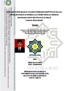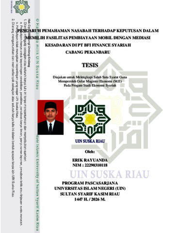 ERIK RAYUANDA, - (2026) PENGARUH PEMAHAMAN NASABAH TERHADAP KEPUTUSAN DALAM MEMILIH FASILITAS PEMBIAYAAN MOBIL DENGAN MEDIASI KESADARAN DI PT BFI FINANCE SYARIAH CABANG PEKANBARU. Thesis thesis, UNIVERSITAS ISLAM NEGERI SULTAN SYARIF KASIM RIAU.
