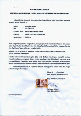 NORLIYANG BILIANTI, - (2026) AN ANALYSIS OF STUDENTS’ SPEAKING FLUENCY AT THE FIRST GRADE OF MADRASAH ALIYAH MASMUR PEKANBARU. Skripsi thesis, Universitas Islam Negeri Sultan Syarif Kasim Riau.
