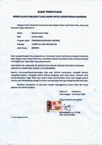 MUHAMMAD AL ATTAR, - (2026) EXPLORING THE LANGUAGE OF INSTRUCTION USED BY THE ENGLISH TEACHER AT IN TEACHING ENGLISH AT JUNIOR HIGH SCHOOL 34 IN PEKANBARU. Skripsi thesis, Universitas Islam Negeri Sultan Syarif Kasim Riau.