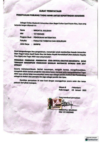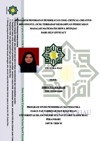 IMROATUL SOLEKAH, - (2026) PENGARUH PENERAPAN PENDEKATAN COOL-CRITICAL-CREATIVE- MEANINGFUL (3CM) TERHADAP KEMAMPUAN PEMECAHAN MASALAH MATEMATIS SISWA DITINJAU DARI SELF-EFFICACY. Skripsi thesis, UNIVERSITAS ISLAM NEGERI SULTAN SYARIF KASIM RIAU.