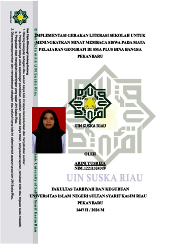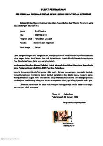 ARINI YUSRIZA, - (2026) IMPLEMENTASI GERAKAN LITERASI SEKOLAH UNTUK MENINGKATKAN MINAT MEMBACA SISWA PADA MATA PELAJARAN GEOGRAFI DI SMA PLUS BINA BANGSA PEKANBARU. Skripsi thesis, UNIVERSITAS ISLAM NEGERI SULTAN SYARIF KASIM RIAU.