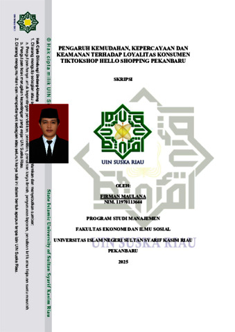 FIRMAN MAULANA (2026) PENGARUH KEMUDAHAN, KEPERCAYAAN DAN KEAMANAN TERHADAP LOYALITAS KONSUMEN TIKTOKSHOP HELLO SHOPPING PEKANBARU. Skripsi thesis, Universitas Islam Negeri Sultan Syarif Kasim.