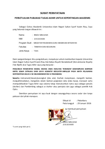 RINDU MAULANA, - (2026) PENGARUH PENERAPAN MODEL MEANS ENDS ANALYSIS TERHADAP KEMAMPUAN BERPIKIR KRITIS SISWA DITINJAU DARI GAYA KOGNITIF REFLEKTIF-IMPULSIF PADA MATA PELAJARAN MATEMATIKA KELAS V SD MUHAMMADIYAH IV PEKANBARU. Thesis thesis, Universitas Islam Negeri Sultan Syarif Kasim Riau.