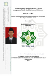 ANALISIS PERAWATAN MESIN CAKE BREAKER CONVEYOR MENGGUNAKAN METODE REALIBILITY CENTERED MAINTENANCE RYAN PRAYOGA WIBOWO NIM : 12050216352 Tanggal Sidang : 15 Januari 2026 Tanggal Wisuda : Jurusan Teknik Industri Fakultas Sains dan Teknologi Universitas Islam Negeri Sultan Syarif Kasim Riau Jl. HR. Soebrantas Km. 15 No. 155, Pekanbaru ABSTRAK Mesin Cake Breaker Conveyor (CBC) merupakan salah satu peralatan penting pada stasiun pengolahan biji (nut dan fiber) di Pabrik Kelapa Sawit (PKS) PT. Mitra Bumi. Mesin ini berperan sebagai penghubung antara stasiun pengepresan dan stasiun pemisahan biji sawit, serta berfungsi dalam proses pemisahan fiber dan nut yang selanjutnya dimanfaatkan sebagai bahan bakar boiler dan bahan baku lanjutan. Namun, berdasarkan data kerusakan selama periode Januari–Desember 2024, mesin CBC mengalami tingkat kerusakan dan downtime yang cukup tinggi, khususnya pada komponen rantai, bearing, daun conveyor, dan elektro motor, yang berdampak langsung pada terhentinya proses produksi dan penurunan kapasitas pengolahan TBS. Sistem perawatan yang diterapkan perusahaan masih bersifat corrective maintenance, yaitu perawatan dilakukan setelah terjadi kerusakan, sehingga dinilai kurang efektif dan berpotensi meningkatkan kerugian waktu maupun biaya. Oleh karena itu, penelitian ini bertujuan untuk mengoptimalkan penjadwalan perawatan mesin CBC dengan menerapkan metode Reliability Centered Maintenance (RCM) dan Preventive Maintenance. Metode RCM digunakan untuk mengidentifikasi komponen kritis, jenis kegagalan, tingkat risiko kerusakan, serta menentukan prioritas tindakan perawatan, sedangkan Preventive Maintenance digunakan untuk menyusun jadwal perawatan berkala yang lebih terencana. Hasil penelitian diharapkan dapat menjadi dasar dalam pengambilan keputusan perawatan mesin CBC, mengurangi frekuensi kerusakan dan downtime, serta meningkatkan keandalan dan ketersediaan mesin sehingga proses produksi di PKS PT. Mitra Bumi dapat berjalan lebih optimal. Kata Kunci : Cake Breaker Conveyor, Downtime, Perawatan Mesin, Preventive Maintenance, Reliability Centered Maintenance