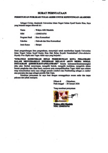 ABSTRAK Nama : Wahyu Alfri Mandela Program Studi : Ilmu Komunikasi Judul : Strategi Komunikasi Dinas Perhubungan Kota Pekanbaru Dalam Menyebarkan Informasi Melalui Akun Media Sosial Instagram @dishub.kotapekanbaru Penelitian ini latar belakang untuk mendeskripsikan bagaimana strategi komunikasi akun media sosial instagram @dishub.kotapekanbaru sebagai media informasi dan komunikasi bagi masyarakat kota pekanbaru. Penelitian ini menggunakan metode deskriptif kualitatif dengan menggunakan teknik wawancara, observasi dan dokumentasi untuk pengumpulan data. Penelitian ini menggunakan Teori Anwar Arifin yaitu mengenal khalayak, menyusun pesan, menetapkan metode, seleksi dan penggunaan media, tahap evaluasi. Hasil penelitian menunjukkan bahwa penggunaan instagram berkontribusi positif sebagai media informasi dan komunikasi bagi masyarakat kota pekanbaru. Akun instagram @dishub.kotapekanbaru yang telah memanfaatkan fitur-fitur yang tersedia seperti feeds, insta story, reels, terbukti dari adanya interaksi dan respon dari pengguna lain atau followers di dalam konten yang diunggah oleh instagram @dishub.kotapekanbaru, instagram @dishub.kotapekanbaru sebagai media yang memberikan akses yang luas terhadap informasi yang bisa diakses oleh masyarakat, bentuk transformasi dalam cara berkomunikasi, berinteraksi dan mengakses informasi bagi masyarakat di kota pekanbaru. Kata Kunci : Strategi Komunikasi, Informasi, Media Sosial, Instagram, @dishub.kotapekanbaru