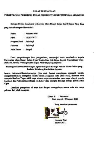 NAZZATUL FITRI (2026) HUBUNGAN KONTROL DIRI DENGAN AGRESIVITAS PADA REMAJA PEMAIN GAME ONLINE YANG BERLATAR BELAKANG PENDIDIKAN AGAMA. Skripsi thesis, Universitas Islam Negeri Sultan Syarif Kasim.