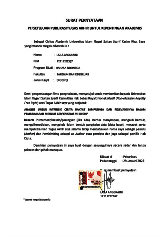 LAILA ANGGRAINI, - (2026) ANALISIS UNSUR INTRINSIK CERITA RAKYAT SAMPURAGA DAN RELEVANSINYA DALAM PEMBELAJARAN MENULIS CERPEN KELAS VII DI SMP. Skripsi thesis, UNIVERSITAS ISLAM NEGERI SULTAN SYARIF KASIM RIAU.