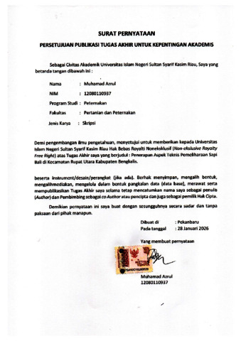 PENERAPAN ASPEK TEKNIS PEMELIHARAAN SAPI BALI DI KECAMATAN RUPAT UTARA KABUPATEN BENGKALIS Azrul (12080111818) Di bawah bimbingan Restu Misrianti dan Elfawati INTISARI Sapi Bali memiliki kemampuan adaptasi yang tinggi terhadap lingkungan tropis dan ketahanannya terhadap pakan berkualitas rendah, terutama pada musim kemarau. Kecamatan Rupat Utara merupakan daerah potensial untuk pengembangan sapi Bali, hal ini dikarenakan populasi yang relatif besar serta lahan yang strategis. Tujuan penelitian ini untuk mengetahui profil peternak dan penerapan aspek teknis pemeliharaan sapi bali meliputi pembibitan, perkandangan, pakan, pemeliharaan dan kesehatan ternak oleh peternak sapi bali yang ada di Kecamatan Rupat Utara Kabupaten Bengkalis, sesuai Permentan No 46/PK.210/8/2015. Penelitian ini telah dilaksanakan pada peternakan rakyat di Kecamatan Rupat Utara Kabupaten Bengkalis pada bulan Desember 2024 sampai dengan Maret 2025. Parameter penelitian ini adalah profil peternak meliputi jenis kelamin, umur, tingkat pendidikan, pengalaman beternak, mata pencaharian utama, jumlah kepemilikan ternak dan lahan, serta penyuluhan atau pelatihan yang pernah diterima terkait pemeliharaan sapi bali; aspek teknis pemeliharaan sapi bali meliputi pembibitan, perkandangan, pakan, pemeliharaan, dan kesehatan ternak. Profil responden dalam penelitian ini seluruhnya berjenis kelamin laki-laki (100%), sebagian besar berada pada kelompok umur 46-50 tahun (40,7%), tingkat pendidikan SMA (49,2%), pengalaman beternak sapi selama 1-8 tahun (72,9%), mata pencaharian utama nelayan (57,6%), status sebagai pemilik ternak dan pemilik lahan (84,7%), serta tidak pernah memperoleh pelatihan atau penyuluhan terkait peternakan (100%). Persentase penerapan aspek teknis pada system pembibitan 20%, perkandangan 24,1%, pakan 4%, pemeliharaan 75%, dan kesehatan 80%. Umumnya penerapan aspek teknis belum memenuhi kriteria berdasarkan Permentan No 46/PK.210/8/2015. Kata kunci: aspek teknis pemeliharaan, Kecamatan Rupat Utara, sapi potong.