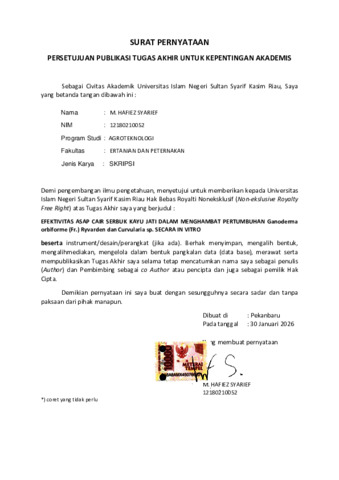 EFEKTIVITAS ASAP CAIR SERBUK KAYU JATI DALAM MENGHAMBAT PERTUMBUHAN Ganoderma orbiforme (Fr.) Ryvarden dan Curvularia sp. SECARA In Vitro M. Hafiez Syarief (12180210052) Di bawah Bimbingan Yusmar Mahmud dan Aulia Rani Annisava INTISARI Ganoderma orbiforme (Fr.) Ryvarden dan Curvularia sp. merupakan patogen yang menyerang tanaman kelapa sawit dan menimbulkan kerugian, sehingga memerlukan pengendalian. Asap cair serbuk kayu jati mengandung senyawa fenolik yang dapat menghambat pertumbuhan patogen. Penelitian ini bertujuan untuk mengetahui dosis terbaik pada asap cair limbah kayu jati yang efektif dalam menghambat pertumbuhan Ganoderma orbiforme (Fr.) Ryvarden dan Curvularia sp. Penelitian ini dilaksanakan pada bulan Februari sampai bulan Juni 2025 di Laboratorian Patomologi, Entomologi, Mikrobiologi dan Ilmu Tanah, Fakultas Pertanian dan Perternakan, Universitas Islam Negeri Sultan Syarif Kasim Riau. Penelitian ini menggunakan rancangan acak lengkap dengan 4 perlakuan yaitu 0% asap cair (kontrol), 1,5% asap cair, 2% asap cair, dan 2,5% asap cair, dengan 4 kali ulangan untuk setiap patogen, sehingga didapatkan 32 unit percobaan. Parameter yang diamati adalah pertumbuhan diameter, laju pertumbuhan, dan indeks antijamur. Hasil penelitian ini menunjukkan bahwa pemberian asap cair serbuk kayu jati dengan konsentrasi 2,5% per cawan petri efektif dalam menghambat pertumbuhan Ganoderma orbiforme (Fr). Ryvarden dengan pertumbuhan diameter 2,04 cm, laju pertumbuhan 0,11 cm/hari, dan memiliki indeks antijamur tertinggi yaitu 77,25%. Pemberian asap cair serbuk kayu jati dengan konsentrasi 2,5% per cawan petri juga efektif dalam menghambat pertumbuhan Curvularia sp. dengan pertumbuhan diameter 2,56 cm, laju pertumbuhan 0,14 cm/hari dan indeks antijamur 67,75%. Kata Kunci: Fenolik, jamur, patogen