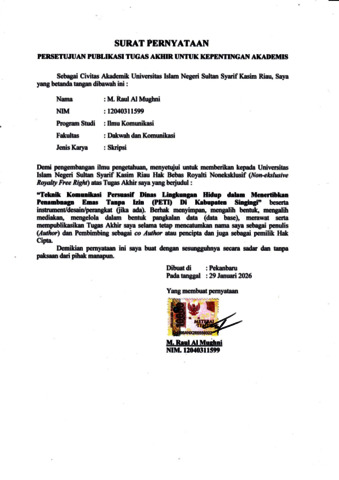 M. RAUL AL MUGHNI (2026) TEKNIK KOMUNIKASI PERSUASIF DINAS LINGKUNGAN HIDUP DALAM MENERTIBKAN PENAMBANGAN EMAS TANPA IZIN (PETI) DI KABUPATEN KUANTAN SINGINGI. Skripsi thesis, UNIVERSITAS ISLAM NEGERI SULTAN SYARIF KASIM RIAU.