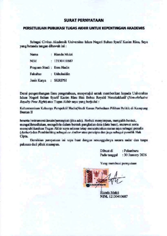 RIANDA MUKTI, - (2026) KEHARMONISAN KELUARGA PERSPEKTIF HADIS (STUDI KASUS PERBEDAAN PILIHAN POLITIK DI KAMPUNG BUATAN II). Skripsi thesis, UNIVERSITAS ISLAM NEGERI SULTAN SYARIF KASIM RIAU.
