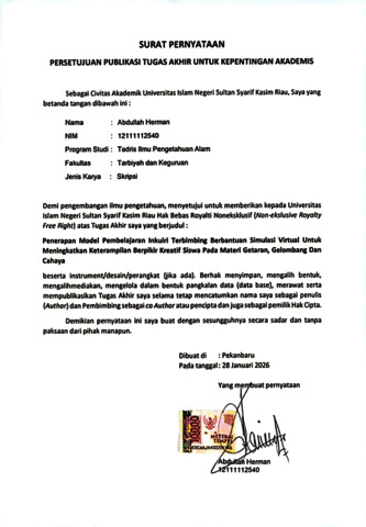ABDULLAH HERMAN (2026) PENERAPAN MODEL PEMBELAJARAN INKUIRI TERBIMBING BERBANTUAN SIMULASI VIRTUAL UNTUK MENINGKATKAN KETERAMPILAN BERPIKIR KREATIF SISWA PADA MATERI GETARAN, GELOMBANG DAN CAHAYA. Skripsi thesis, Universitas Islam Negeri Sultan Syarif Kasim.