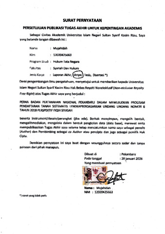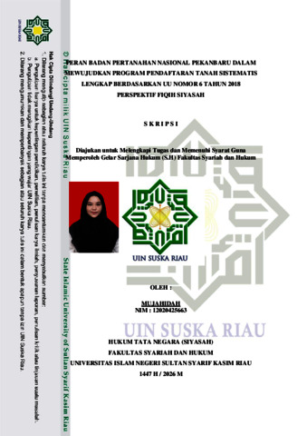 MUJAHIDAH, - (2026) PERAN BADAN PERTANAHAN NASIONAL PEKANBARU DALAM MEWUJUDKAN PROGRAM PENDAFTARAN TANAH SISTEMATIS LENGKAP BERDASARKAN UU NOMOR 6 TAHUN 2018 PERSPEKTIF FIQIH SIYASAH. Skripsi thesis, UNIVERSITAS ISLAM NEGERI SULTAN SYARIF KASIM RIAU.