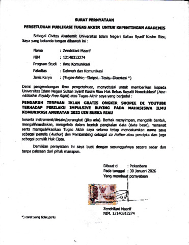 -, ZENDRIFANI MAARIF (2026) PENGARUH TERPAAN IKLAN GRATIS ONGKIR SHOPEE DI YOUTUBE TERHADAP PERILAKU IMPULSIVE BUYING PADA MAHASISWA ILMU KOMUNIKASI ANGKATAN 2022 UIN SUSKA RIAU. Skripsi thesis, Uin Sultan Syarif Kasim Riau.