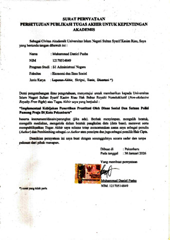ii ABSTRAK IMPLEMENTASI KEBIJAKAN PENERTIBAN PROSTITUSI OLEH DINAS SOSIAL DAN SATUAN POLISI PAMONG PRAJA DI KOTA PEKANBARU Oleh : Muhammad Daniel Pasha NIM: 12170514849 Penelitian ini bertujuan untuk mengkaji pelaksanaan kebijakan penertiban prostitusi oleh Dinas Sosial dan Satuan Polisi Pamong Praja di Kota Pekanbaru serta mengidentifikasi berbagai faktor yang menjadi kendala dalam implementasinya. Penelitian ini menggunakan pendekatan kualitatif dengan metode pengumpulan data berupa wawancara mendalam, observasi lapangan, dan studi dokumentasi pada instansi terkait, yaitu Satuan Polisi Pamong Praja (Satpol PP) dan Dinas Sosial Kota Pekanbaru. Hasil penelitian menunjukkan bahwa pelaksanaan kebijakan penanganan prostitusi di Kota Pekanbaru dilakukan melalui upaya penertiban berupa razia rutin oleh Satpol PP serta pelaksanaan program rehabilitasi sosial oleh Dinas Sosial. Namun, efektivitas pelaksanaannya belum optimal, ditandai dengan masih ditemukannya praktik prostitusi di berbagai lokasi. Proses rehabilitasi yang dilakukan juga belum mampu memberikan efek jera yang berkelanjutan, sehingga sebagian Pekerja Seks Komersial (PSK) kembali melakukan aktivitas prostitusi setelah rehabilitasi selesai. Dari sisi internal organisasi, peningkatan kapasitas sumber daya manusia pada Bidang Rehabilitasi Sosial masih diperlukan, terutama dalam bentuk pelatihan berkelanjutan untuk memperkuat kompetensi pegawai dalam menangani klien secara profesional. Penelitian ini juga menemukan beberapa faktor penghambat dalam implementasi kebijakan, antara lain keterbatasan sarana dan prasarana rehabilitasi yang dimiliki pemerintah daerah serta tidak adanya mekanisme efek jera yang mampu menekan angka praktik prostitusi secara konsisten. Keterbatasan fasilitas menyebabkan proses pembinaan dan pemulihan tidak dapat dilakukan secara intensif dan berkelanjutan, sementara lemahnya deterrent effect menjadikan kebijakan belum berjalan efektif. Secara keseluruhan, optimalisasi implementasi kebijakan penanganan prostitusi di Kota Pekanbaru membutuhkan peningkatan kapasitas SDM, penguatan fasilitas rehabilitasi, dan penyusunan mekanisme sanksi atau intervensi yang lebih tegas. Kata Kunci: implementasi kebijakan, prostitusi, rehabilitasi sosial, Satpol PP, Dinas Sosial.