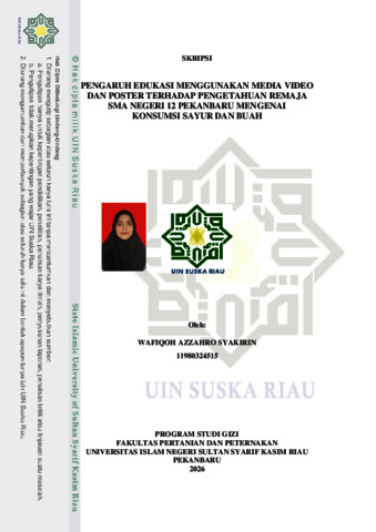 WAFIQOH AZZAHRO SYAKIRIN, - (2026) PENGARUH EDUKASI MENGGUNAKAN MEDIA VIDEO DAN POSTER TERHADAP PENGETAHUAN REMAJA SMA NEGERI 12 PEKANBARU MENGENAI KONSUMSI SAYUR DAN BUAH. Skripsi thesis, Universitas Islam Negeri Sultan Syarif Kasim Riau.