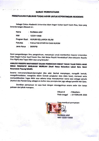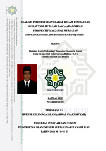 RAZMAN ARIF, - (2026) ANALISIS PERSEPSI MASYARAKAT DALAM PEMBACAAN SIGHAT TAKLIK TALAK PASCA AKAD NIKAH PERSPEKTIF MASLAHAH MURSALAH (STUDI KASUS KELURAHAN LABUH BARU BARAT KEC.PAYUNG SEKAKI). Skripsi thesis, Universitas Islam Negeri Sultan Syarif Kasim Riau.