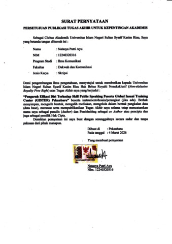 NATASYA PUTRI AYU, - (2026) PENGARUH EFIKASI DIRI TERHADAP SKILL PUBLIC SPEAKING PESERTA GLOBAL INSANI TRAINING CENTER (GISTER) PEKANBARU. Skripsi thesis, Universitas Islam Negeri Sultan Syarif Kasim Riau.