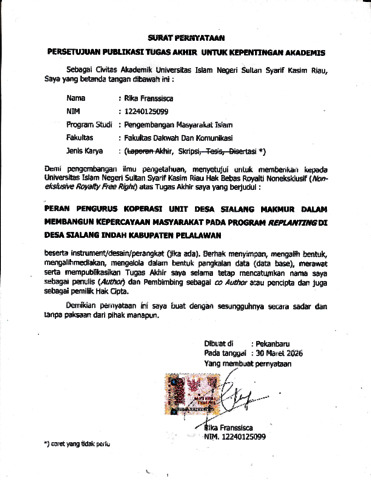 RIKA FRANSSISCA, - (2026) PERAN PENGURUS KOPERASI UNIT DESA (KUD) SIALANG MAKMUR DALAM MEMBANGUN KEPERCAYAAN MASYARAKAT PADA PROGRAM REPLANTING DI DESA SIALANG INDAH KABUPATEN PELALAWAN. Skripsi thesis, Universitas Islam Negeri Sultan Syarif Kasim Riau.