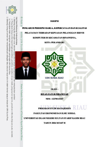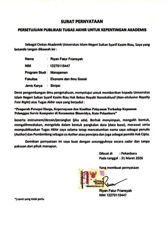 RIYAN FATUR FRIANSYAH, - (2026) PENGARUH PERSEPSI HARGA, KEPERCAYAAN, DAN KUALITAS PELAYANAN TERHADAP KEPUASAN PELANGGAN SERVIS KOMPUTER DI KECAMATAN BINAWIDYA, KOTA PEKANBARU. Skripsi thesis, Universitas Islam Negeri Sultan Syarif Kasim Riau.