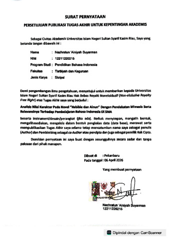 NAZHRATUN 'AINIYAH SUYARMAN, - (2026) ANALISIS NILAI KARAKTER PADA NOVEL "HABIBIE DAN AINUN" DENGAN PENDEKATAN MIMESIS SERTA RELEVANSINYA TERHADAP PEMBELAJARAN BAHASA INDONESIA DI SMA. Skripsi thesis, Uin Sultan Syarif Kasim Riau.