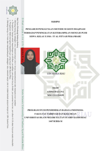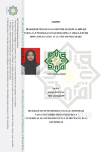 ABSTRAK Atina Hazana, (2026) : Pengaruh Penggunaan Metode Sugesti Imajinasi Untuk Meningkatkan Keterampilan Menulis Puisi Siswa Kelas X SMA IT AL Fityah Pekanbaru. Penelitian ini dilatar belakangi oleh rendahnya keterampilan menulis puisi sisiwa kelas X dan kurangnya ide siswa dalam menulis puisi serta inovasi pembelajaran yang belum maksimal. Penelitian ini bertujuan untuk mengetahui pengaruh metode sugesti imajinasi untuk meningkatkan keterampilan menulis puisi siswa kelas X SMA IT AL Fityah Pekanbaru. Penelitian ini menggunakan pendekatan kuantitatif dengan desain eksperimen. Teknik pengumpilan data dilakukan melalui tes menulis puisi berupa pretest dan posttest. Analisis data dilakukan melalui uji normalitas, uji homogenitas, dan uji hipotesis menggunakan paired sampel t-test. Instrumen yang digunakan adalah tes menulis puisi dengan indikator penilaian yang meliputi diksi, rima, gaya bahasa, makna, dan amanat. Metode ini juga didukung oleh penggunaan media audiovisual untuk merangsang imajinasi siswa. Hasil penelitian menunjukkan adanya peningktan signifikan dalam kemampuan menulis puisi siswa. Nilai rata-rata siswa meningkat dari 41,6 pada saat pretest menjadi 71,9 pada saat posttest. Berdasarkan uji hipotesis, diperoleh nilai t-hitung sebesar 18,5880 yang lebih besar dari t-tabel yaitu 1,6716 (18, 5880>1,6716), sehingga hipotesis alternatif (Ha) diterima. Hal ini membuktikan bahwa metode sugesti imajinasi berpengaruh secara signifikan terhadap peningkatan keterampilan menulis puisi siswa. Kata Kunci: Metode Sugesti Imajinasi, Keterampilan Menulis, Puisi.
