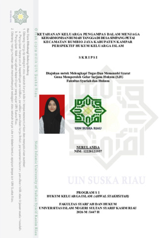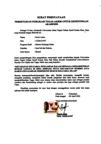 ABSTRAK Nurul Anisa, (2026): Ketahanan Keluarga Pengampas dalam Menjaga Keharmonisan Rumah Tangga di Desa Simpang Petai Kecamatan Rumbio Jaya Kabupaten Kampar Perspektif Hukum Keluarga Islam Penelitian ini dilatarbelakangi oleh adanya perbedaan antara konsep ideal keluarga dengan realitas yang terjadi di masyarakat. Secara umum, keluarga dipahami sebagai satu kesatuan yang hidup bersama dan menjalankan hak serta kewajiban secara langsung. Namun, pada keluarga pengampas di Desa Simpang Petai, suami harus meninggalkan rumah dalam jangka waktu lama karena pekerjaan sebagai pedagang keliling, sehingga menyebabkan keterpisahan fisik yang berpotensi mempengaruhi keharmonisan rumah tangga. Penelitian ini bertujuan untuk: pertama, mendeskripsikan bentuk ketahanan keluarga pengampas dalam menjaga keharmonisan rumah tangga; kedua, mengidentifikasi faktor-faktor yang mendukung dan menghambat ketahanan keluarga; ketiga, menganalisis ketahanan keluarga pengampas dalam perspektif hukum keluarga Islam. Penelitian ini merupakan penelitian lapangan (field research) dengan pendekatan empiris dan bersifat deskriptif kualitatif. Data diperoleh melalui wawancara, observasi, dan dokumentasi terhadap keluarga pengampas di Desa Simpang Petai, kemudian dianalisis melalui reduksi data, penyajian data, dan penarikan kesimpulan. Hasil penelitian menunjukkan bahwa ketahanan keluarga pengampas tetap dapat terjaga meskipun terjadi keterpisahan fisik, selama terdapat komunikasi yang baik, rasa saling percaya, dan komitmen dalam menjalankan peran masing-masing. Faktor pendukung meliputi kesepahaman sejak awal pernikahan, tanggung jawab suami dalam memenuhi nafkah, nilai-nilai keagamaan, serta dukungan keluarga. Sedangkan faktor penghambat meliputi lamanya keterpisahan, kurangnya komunikasi, beban ganda istri, dan keterbatasan nafkah batin. Dalam perspektif hukum keluarga Islam, ketahanan keluarga tidak hanya ditentukan oleh kehadiran fisik, tetapi oleh terpenuhinya keseimbangan hak dan kewajiban sesuai syariat. Kata Kunci: Ketahanan keluarga, pengampas, harmonis, Desa Simpang Petai, Hukum Keluarga Islam.