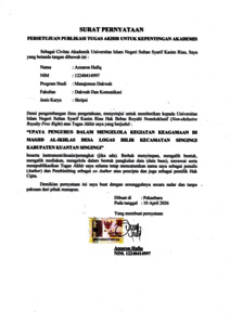 ABSTRAK Nama : Azzaron Hafiq Program Studi : Manajemen Dakwah Judul : Upaya Pengurus Dalam Mengelola Kegiatan Keagamaan Masjid Al-Ikhlas Di Desa Logas Hilir Kecamatan Singingi Kabupan Kuantan Singingi Penelitian ini bertujuan untuk mengetahui upaya pengurus masjid dalam mengelola kegiatan keagamaan di Masjid Al-Ikhlas Desa Logas Hilir Kecamatan Singingi Kabupaten Kuantan Singingi. Metode penelitian yang digunakan adalah metode kualitatif dengan pendekatan deskriptif. Teknik pengumpulan data dilakukan melalui observasi, wawancara, dan dokumentasi. Informan dalam penelitian ini adalah pengurus masjid dan masyarakat sekitar yang terlibat dalam kegiatan keagamaan. Data yang diperoleh kemudian dianalisis dengan cara reduksi data, penyajian data, dan penarikan kesimpulan. Hasil penelitian menunjukkan bahwa pengurus Masjid Al-Ikhlas telah melakukan berbagai upaya dalam mengelola kegiatan keagamaan, antara lain melalui perencanaan kegiatan, pelaksanaan kegiatan keagamaan seperti pengajian, wirid yasin, dan peringatan hari besar Islam, serta melakukan sosialisasi kepada masyarakat. Selain itu, terdapat perubahan yang signifikan setelah pergantian pengurus, dimana pengelolaan masjid menjadi lebih terarah dan kegiatan keagamaan semakin berkembang. Meskipun demikian, partisipasi masyarakat masih perlu ditingkatkan agar kegiatan dapat berjalan lebih optimal. Simpulan utama penelitian ini adalah bahwa upaya pengurus masjid memiliki peran penting dalam meningkatkan pengelolaan kegiatan keagamaan, sehingga mampu mendorong kemakmuran masjid dan meningkatkan keterlibatan masyarakat dalam kegiatan keagamaan. Kata Kunci: Pengurus Masjid, Kegiatan Keagamaan, Pengelolaan Masjid