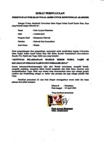 ABSTRAK Nama : Faris Acryan Muammar Jurusan : Manajemen Dakwah Judul : Aktivitas Pelaksanaan Majelis Dzikir Nurul Yaqin Di Kecamatan Peranap Majelis dzikir merupakan salah satu bentuk kegiatan keagamaan yang berperan dalam meningkatkan keimanan dan mempererat hubungan sosial masyarakat. Majelis Dzikir Nurul Yaqin di Kecamatan Peranap Kabupaten Indragiri Hulu merupakan kegiatan keagamaan yang berkembang sejak tahun 2021 dengan jumlah jamaah yang terus meningkat serta pelaksanaan kegiatan yang semakin meluas. Penelitian ini bertujuan untuk mengetahui aktivitas yang dilakukan dalam majelis dzikir, mendeskripsikan pelaksanaan kegiatan, serta mengidentifikasi faktor pendukung dan penghambat dalam pelaksanaannya. Penelitian ini menggunakan pendekatan kualitatif dengan jenis penelitian lapangan, sedangkan teknik pengumpulan data dilakukan melalui observasi, wawancara, dan dokumentasi. Hasil penelitian menunjukkan bahwa aktivitas Majelis Dzikir Nurul Yaqin meliputi penyampaian ceramah atau tausiyah sebelum dzikir, pelaksanaan dzikir dan doa bersama, serta kegiatan sosial seperti makan bersama. Pelaksanaan kegiatan dilakukan secara rutin dua kali dalam seminggu dengan lokasi yang berpindah-pindah di mushalla dan masjid. Faktor pendukung kegiatan ini meliputi antusiasme jamaah, peran tokoh agama, serta lingkungan masyarakat yang religius, sedangkan faktor penghambatnya meliputi kesibukan jamaah, jarak lokasi, dan keterbatasan fasilitas. Secara keseluruhan, aktivitas dan pelaksanaan Majelis Dzikir Nurul Yaqin memberikan dampak positif dalam meningkatkan kesadaran beribadah, mempererat hubungan sosial, serta menumbuhkan kebersamaan dalam kehidupan masyarakat. Kata kunci: Aktivitas, Pelaksanaan, Majelis Dzikir, Jamaah
