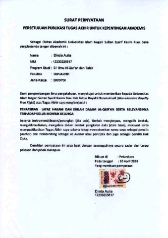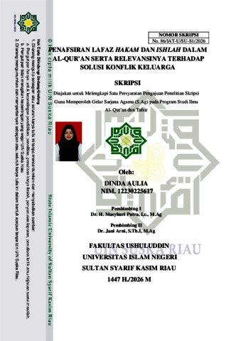 DINDA AULIA, - (2026) PENAFSIRAN LAFAZ HAKAM DAN ISHLAH DALAM AL-QUR'AN SERTA RELEVANSINYA TERHADAP SOLUSI KONFLIK KELUARGA. Skripsi thesis, UNIVERSITAS ISLAM NEGERI SULTAN SYARIF KASIM RIAU.