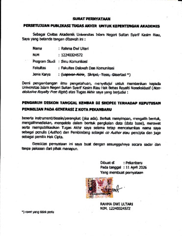 RAHMA DWI ULTARI, - (2026) PENGARUH DISKON TANGGAL KEMBAR DI SHOPEE TERHADAP KEPUTUSAN PEMBELIAN PADA GENERASI Z KOTA PEKANBARU. Skripsi thesis, Universitas Islam Negeri Sultan Syarif Kasim.