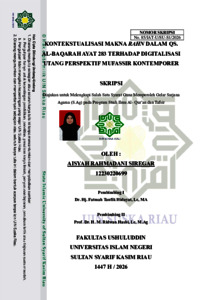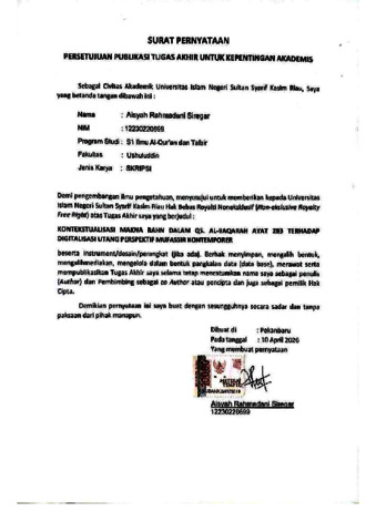 Skripsi ini berjudul “ KONTEKSTUALISASI MAKNA RAHN DALAM QS. Al-Baqarah AYAT 283 TERHADAP DIGITALISASI UTANG PERSPEKTIF MUFASSIR KONTEMPORER.” Penelitian ini dilatarbelakangi oleh pesatnya perkembangan digitalisasi utang yang memberikan kemudahan akses pembiayaan, namun berpotensi mengabaikan prinsip keadilan, transparansi, dan perlindungan hak dalam transaksi muamalah. Penelitian ini bertujuan untuk menganalisis penafsiran Q.S. Al-Baqarah ayat 283 tentang konsep Rahn menurut mufassir kontemporer serta mengkaji kontekstualisasi digitalisasi utang berdasarkan makna Rahn dalam perspektif Al-Qur’an. Jenis penelitian ini merupakan penelitian kepustakaan dengan pendekatan kualitatif. Metode yang digunakan adalah metode tahlili dengan pendekatan deskriptif-analitis. Sumber data primer meliputi Tafsir al-Tahrīr wa al-Tanwīr karya Ibnu ‘Āsyūr, Tafsir al-Munīr karya Wahbah az-Zuḥailī, dan Tafsir al-Miṣbāḥ karya M. Quraish Shihab. Adapun sumber data sekunder diperoleh dari buku, jurnal ilmiah, serta literatur terkait. Hasil penelitian menunjukkan bahwa Rahn dalam Q.S. Al-Baqarah ayat 283 tidak hanya dipahami sebagai mekanisme teknis jaminan dalam transaksi utang-piutang, tetapi sebagai instrumen syariat yang bertujuan menjaga kepastian hak, keadilan ekonomi, dan tanggung jawab moral, sejalan dengan maqāṣid al-syarī‘ah, khususnya ḥifẓ al-māl. Kontekstualisasi digitalisasi utang menunjukkan bahwa transformasi teknologi tidak mengubah makna Rahn, melainkan hanya pada aspek mekanisme pelaksanaannya. Digitalisasi transaksi utang dapat diterima selama tetap menjaga substansi akad, menghindari unsur riba, gharar, dan dharar, serta menjunjung tinggi nilai keadilan, amanah, transparansi, dan perlindungan hak. Dengan demikian, konsep Rahn tetap relevan dan adaptif dalam dinamika ekonomi digital modern. Kata kunci: Rahn, Digitalisasi Utang, QS. Al-Baqarah Ayat 283, Mufassir Kontemporer