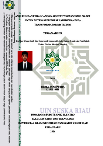 HERLY SYAHPUTRA, - (2026) ANALISIS DAN PERANCANGAN SINGLE TUNED PASSIVE FILTER UNTUK MITIGASI DISTORSI HARMONISA PADA TRANSFORMATOR DISTRIBUSI. Skripsi thesis, UNIVERSITAS ISLAM NEGERI SULTAN SYARIF KASIM RIAU.