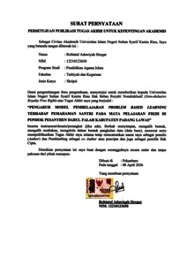 ABSTRAK Robiatul Adawiyah Siregar, (2026): Pengaruh Model Pembelajaran Problem Based Learning terhadap Pemahaman Santri pada Mata Pelajaran Fikih di Pondok Pesantren Darul Falah Kabupaten Padang Lawas. Penelitian ini bertujuan untuk menguji pengaruh model pembelajaran problem based learning terhadap pemahaman santri pada mata pelajaran Fikih di Pondok Pesantren Darul Falah Kabupaten Padang Lawas. Penelitian ini menggunakan pendekatan kuantitatif dengan desain penelitian Quasi Eksperimen. Populasi dalam penelitian ini adalah seluruh santri kelas VIII yang mengikuti mata pelajaran Fikih di Pondok Pesantren Darul Falah Kabupaten Padang Lawas yang berjumlah 69 santri, dengan sampel penelitian berjumlah 47 santri. Teknik pengumpulan data menggunakan observasi, tes dan dokumentasi. Teknik analisis data menggunakan test ‗‘t‘‘ (Independent Sample t-Test). Berdasarkan hasil penelitian dapat disimpulkan bahwa terdapat perbedaan yang signifikan pemahaman santri antara penggunaan model pembelajaran problem based learning dengan metode tanya jawab pada mata pelajaran Fikih di Pondok Pesantren Darul Falah Kabupaten Padang Lawas, diperoleh t hitung > t tabel ( 6, 751 > 2,000 ) dan nilai Sig. 2 – tailed 0,000 < 0,05 yang berarti Ha diterima dan Ho ditolak. Kata Kunci : Model Pembelajaran Problem Based Learning, Pemahaman Santri
