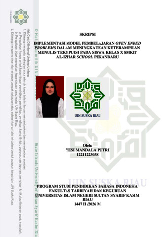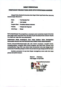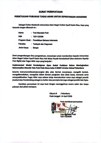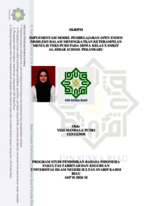 ABSTRAK Yesi Mandala Putri (2026) : Implementasi Model Pembelajaran Open Ended Problems Dalam Meningkatkan Keterampilan Menulis Teks Puisi Pada Siswa Kelas X SMKIT Al-Izhar School Pekanbaru. Rendahnya keterampilan menulis puisi siswa kelas X SMKIT Al-Izhar menyebabkan kesulitan untuk mencapai tujuan pembelajaran. Penelitian ini bertujuan untuk mengetahui implementasi model pembelajaran Open Ended Problems dalam meningkatkan keterampilan menulis teks puisi pada siswa kelas X SMKIT Al-Izhar School Pekanbaru. Penelitian ini menggunakan metode kuantitatif dengan desain Pre-Experimental dengan jenis One-Group PretestPosttest Design. Sampel dalam penelitian ini terdiri dari 43 siswa kelas X SMKIT Al-Izhar School Pekanbaru menggunakan teknik pengambilan Sampling Jenuh. Teknik pengumpulan data menggunakan observasi dan unjuk kerja. Teknik analisis data menggunakan aktivitas guru dan siswa dan uji “t” ( paired sample ttest). Berdasarkan proses aktivitas guru dan siswa dapat dilihat bahwa proses implementasi model pembelajaran Open Ended Problems dalam meningkatkan keterampilan menulis puisi siswa pada kelas X SMKIT Al-Izhar School Pekanbaru berada pada kategori sangat baik. Pada pertemuan pertama presentase aktivitas guru 88% dan aktivitas peserta didik 86,7%. Kemudian pada pertemuan kedua dengan presentase aktivitas guru 94,7% dan aktivitas peserta didik 92%. Berdasarkan hasil uji t, dapat disimpulkan bahwa terdapat perbedaan setelah diimplementasikan model pembelajaran Open Ended Problems terhadap peningkatan kemampuan menulis teks puisi siswa kelas X SMKIT Al-Izhar School Pekanbaru dengan nilai t hitung (26.101)> t tabel (2,018) dengan taraf signifikansi 5%, dan nilai sig.2 tailed 0,00 < 0,05, maka H 0 x ditolak dan H a diterima. Kata Kunci: Model Open Ended Problems, Menulis Teks Puisi.