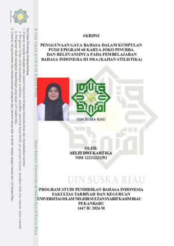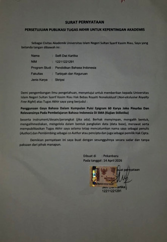 SELFI DWI KARTIKA (2026) PENGGUNAAN GAYA BAHASA DALAM KUMPULAN PUISI EPIGRAM 60 KARYA JOKO PINURBO DAN RELEVANSINYA PADA PEMBELAJARAN BAHASA INDONESIA DI SMA (KAJIAN STILISTIKA). Skripsi thesis, Universitas Islam Negeri Sultan Syarif Kasim.