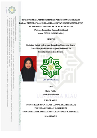 "ABSTRAK Raisa Nabila, (2026): Tinjauan Maslahah Terhadap Pertimbangan Hukum Dalam Menetapkan Hak Asuh Anak Yang Belum Mumayyiz Kepada Ibu Yang Melakukan Kekerasan (Putusan Pengadilan Agama Bukittinggi Nomor 525/Pdt.G/2024/PA.Bkt) Penelitian ini dilatarbelakangi oleh penetapan hak asuh anak yang belum mumayyiz kepada ibu yang melakukan kekerasan berdasarkan kesepakatan mediasi dalam perkara cerai gugat Putusan Nomor 525/Pdt.G/2024/PA.Bkt. Dalam perkara tersebut, hakim mengesahkan kesepakatan mediasi yang memberikan hak hadhanah kepada ibu, meskipun dalam persidangan terungkap adanya dalil dan kesaksian mengenai tindakan kekerasan fisik dan verbal terhadap anak. Kondisi ini menimbulkan persoalan hukum terkait kesesuaian pertimbangan hakim dengan prinsip kemaslahatan bagi anak. Rumusan masalah dalam penelitian ini meliputi: Apa yang menjadi dasar pertimbangan hakim Pengadilan Agama Bukittinggi Kelas 1B dalam menetapkan hak asuh anak pada kasus cerai gugat dengan nomor perkara 525/Pdt.G/2024/PA.Bkt, serta bagaimana analisis pertimbangan hakim tersebut ditinjau dari perspektif maslahah. Penelitian ini bertujuan untuk mengetahui dasar pertimbangan hakim dalam menetapkan hak asuh anak melalui kesepakatan mediasi serta menganalisis kesesuaian pertimbangan tersebut dengan prinsip maslahah dalam hukum Islam. Jenis penelitian yang digunakan adalah penelitian kepustakaan (library research). Sumber data diperoleh dari bahan hukum primer berupa putusan pengadilan, peraturan perundang-undangan, dan Kompilasi Hukum Islam, serta bahan hukum sekunder berupa buku, jurnal, dan karya ilmiah yang relevan dengan hadhanah dan maslahah. Data dianalisis dengan teknik analisis deskriptif analitis menggunakan perspektif maslahah. Hasil penelitian menunjukkan bahwa pertimbangan hakim dalam menetapkan hak asuh anak dalam putusan tersebut lebih menitikberatkan pada kesepakatan mediasi para pihak, tanpa disertai analisis mendalam terhadap dampak dan risiko kekerasan terhadap anak. Dari perspektif maslahah, penetapan hak asuh tersebut berpotensi bertentangan dengan tujuan hukum Islam dalam melindungi keselamatan dan kepentingan anak, karena kemaslahatan anak seharusnya menjadi prioritas utama dalam penetapan hadhanah. Kata Kunci: hak asuh anak, hadhanah, pertimbangan hakim, maslahah."