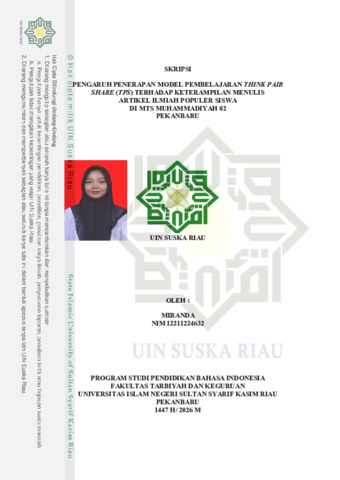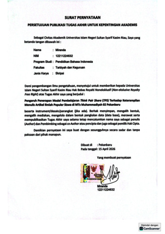 MIRANDA, - (2026) PENGARUH PENERAPAN MODEL PEMBELAJARAN THINK PAIR SHARE (TPS) TERHADAP KETERAMPILAN MENULIS ARTIKEL ILMIAH POPULER SISWA DI MTS MUHAMMADIYAH 02 PEKANBARU. Skripsi thesis, Universitas Islam Negeri Sultan Syarif Kasim Riau.