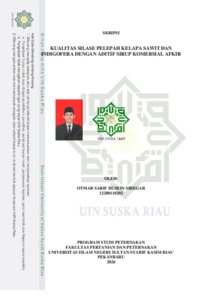 KUALITAS SILASE PELEPAH KELAPA SAWIT DAN INDIGOFERA DENGAN ADITIF SIRUP KOMERSIAL AFKIR Otmar Sarif Husein Siregar (12280110202) Di bawah bimbingan Sadarman dan Dewi Febrina INTISARI Pelepah kelapa sawit merupakan bahan pakan berserat tinggi yang umumnya memiliki tingkat kecernaan rendah pada ternak ruminansia. Upaya untuk meningkatkan kualitasnya dapat dilakukan dengan menambahkan Indigofera zollingeriana sebagai sumber protein nabati serta menerapkan fermentasi anaerob dengan bantuan sirup komersial afkir sebagai sumber energi bagi mikroba fermentatif. Penelitian ini bertujuan untuk menilai pengaruh penambahan sirup komersial afkir terhadap mutu silase campuran pelepah kelapa sawit dan Indigofera zollingeriana. Penelitian menggunakan rancangan acak lengkap (RAL) dengan lima perlakuan dan lima ulangan. Perlakuan terdiri atas penambahan sirup komersial afkir sebanyak 1,50%; 3%; 4,50%, dan 6% dari bahan kering, sedangkan P1 sebagai kontrol terdiri atas 75% pelepah kelapa sawit dan 25% Indigofera. Parameter yang diukur meliputi kadar bahan kering (BK), kehilangan bahan kering (KBK), nilai pH, dan nilai fleigh (NF). Data dianalisis menggunakan analisis ragam (ANOVA) dan dilanjutkan dengan uji DMRT pada taraf 5%. Hasil penelitian menunjukkan penambahan sirup komersial afkir berpengaruh nyata terhadap nilai pH dan nilai fleigh silase, kadar BK dan KBK tidak menunjukkan perbedaan antar perlakuan. Perlakuan terbaik diperoleh pada P5 (6% BK) dengan nilai fleigh tertinggi (108±4,97) dan pH terendah (3,98±0,03). Penggunaan sirup komersial afkir sebanyak 6% dari bahan kering dinilai paling efektif untuk meningkatkan kualitas silase campuran pelepah kelapa sawit dan Indigofera zollingeriana. Kata kunci: Pelepah kelapa sawit, Indigofera zollingeriana, sirup afkir, silase,