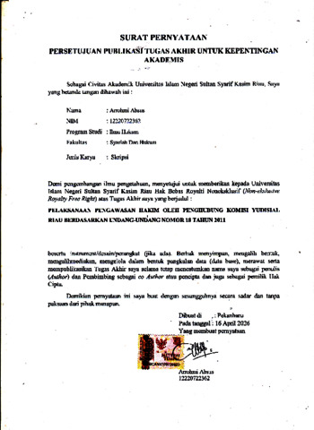 ARROHMI ABSUS, - (2026) PELAKSANAAN PENGAWASAN HAKIM OLEH PENGHUBUNG KOMISI YUDISIAL RIAU BERDASARKAN UNDANG-UNDANG NOMOR 18 TAHUN 2011. Skripsi thesis, UNIVERSITAS ISLAM NEGERI SULTAN SYARIF KASIM RIAU.