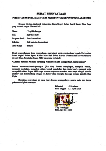 YOGI HERLANGGA (2026) ANALISIS PERSEPSI AUDIENS TERHADAP VIDIO BOOTH 360 DERAJAT SAAT ACARA KONSER. Skripsi thesis, Universitas Islam Negeri Sultan Syarif Kasim.