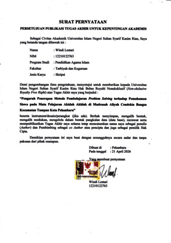 WINDI LESTARI, - (2026) PENGARUH PENERAPAN METODE PEMBELAJARAN PROBLEM SOLVING TERHADAP PEMAHAMAN SISWA PADA MATA PELAJARAN AKIDAH AKHLAK DI MADRASAH ALIYAH CENDEKIA BANGSA KECAMATAN TAMPAN KOTA PEKANBARU. Skripsi thesis, UNIVERSITAS ISLAM NEGERI SULTAN SYARIF KASIM RIAU.