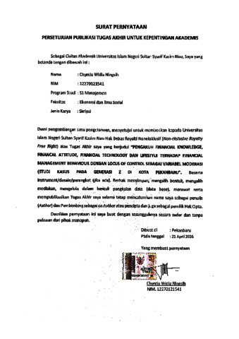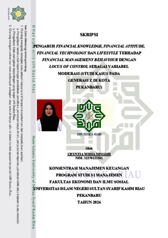 CHYNTIA WIDIA NINGSIH (2026) PENGARUH FINANCIAL KNOWLEDGE, FINANCIAL ATTITUDE, FINANCIAL TECHNOLOGY DAN LIFESTYLE TERHADAP FINANCIAL MANAGEMENT BEHAVIOUR DENGAN LOCUS OF CONTROL SEBAGAI VARIABEL MODERASI (STUDI KASUS PADA GENERASI Z DI KOTA PEKANBARU). Thesis thesis, Univesitas islam sultan syarif Kasim Riau.