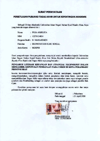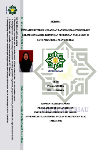 PUJA ANJELITA (2026) PENGARUH LITERASI KEUANGAN DAN FINANCIAL TECHNOLOGY DALAM MENGAMBIL KEPUTUSAN PENDANAAN PADA UMKM DI KOTA PEKANBARU PROVINSI RIAU. Skripsi thesis, Univesitas islam sultan syarif Kasim Riau.
