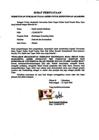 SARAH JUMIATI HASIBUAN, - (2026) PENGARUH RELIGIUSITAS TERHADAP KECEMASAN MASA DEPAN PADA MAHASISWA AKHIR ANGKATAN 2022 FAKULTAS DAKWAH DAN KOMUNIKASI UNIVERSITAS ISLAM NEGERI SULTAN SYARIF KASIM RIAU. Skripsi thesis, UNIVERSITAS ISLAM NEGERI SULTAN SYARIF KASIM RIAU.